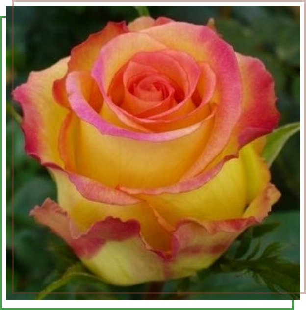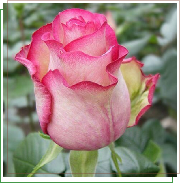 Довольно молодой сорт роз, но он уже по праву завоевал место среди самых ярких представителей двухцветных роз. Классические бутоны среднего размера около 10 см закручены в изящный бокал. Интересная расцветка лепестков, плавно переходящая от белого до фиолетово-розового по краям.