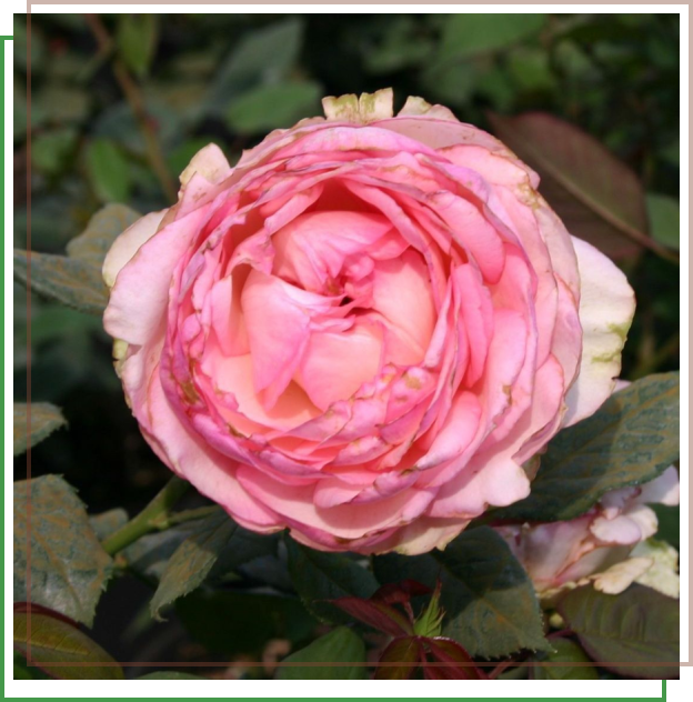 Цветки бело-кремовые с розово-карминной каймой, огромные, диаметром 13-14 см, густомахровые (90-100 лепестков), шаровидные. Аромат зрелого персика. Кусты прочные, прямые. высотой 90-110 см.